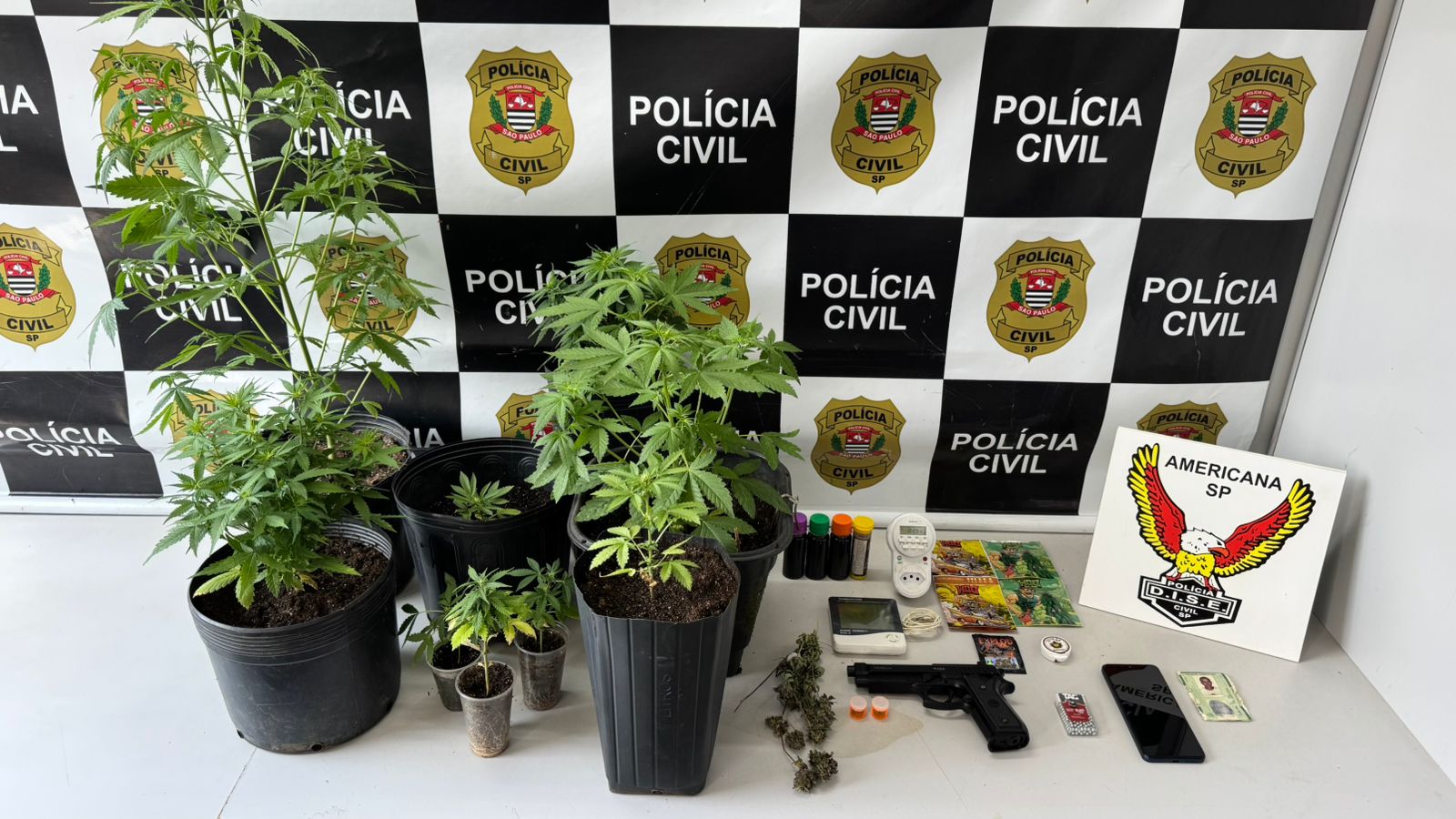 Entre os objetos apreendidos estavam petrechos utilizados no cultivo, como um timer e um termômetro digital, além de três frascos com líquido não identificado, um aparelho celular e um simulacro de pistola.