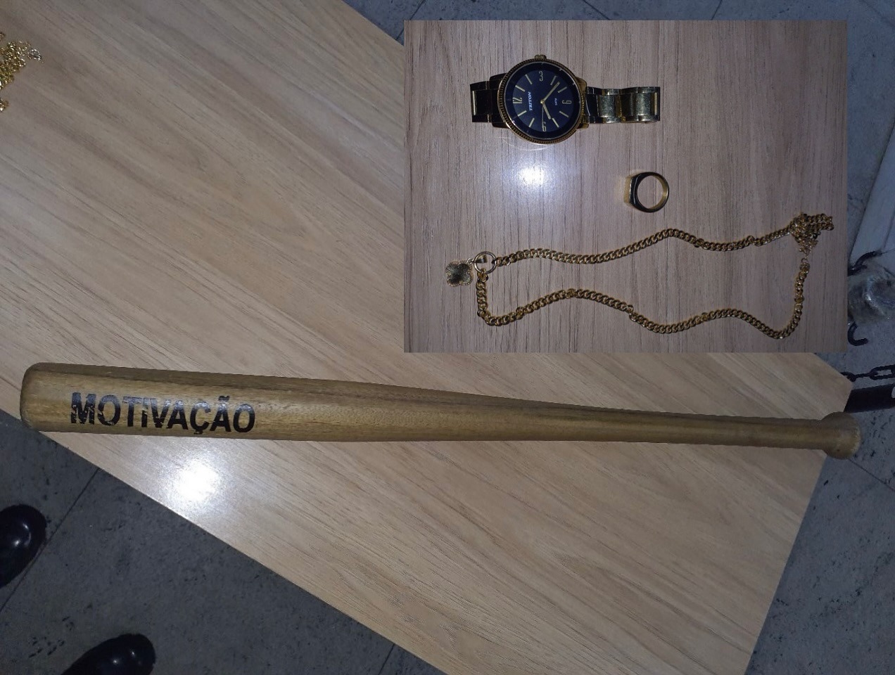 Com base nos relatos, a equipe localizou os três homens nas proximidades. Em inspeção veicular, foram encontrados os pertences da vítima e o bastão utilizado nas agressões.
