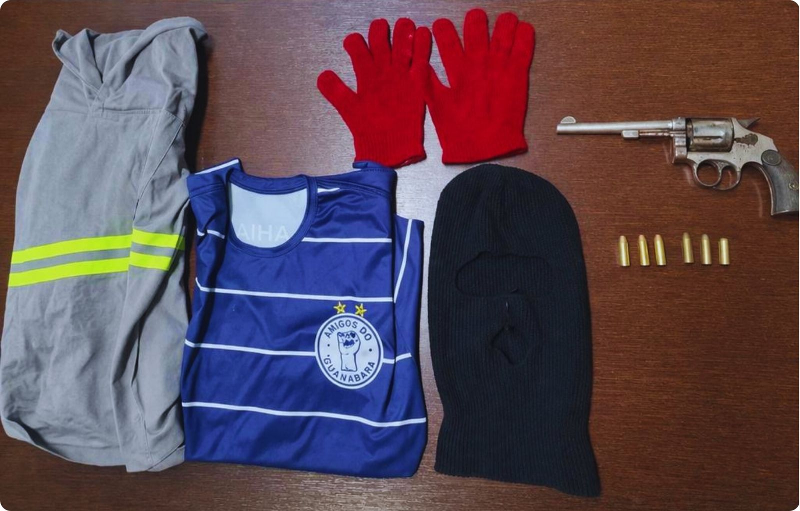 - Vestuário utilizado na ação (blusas e camisa) e a balaclava descartada durante a fuga.